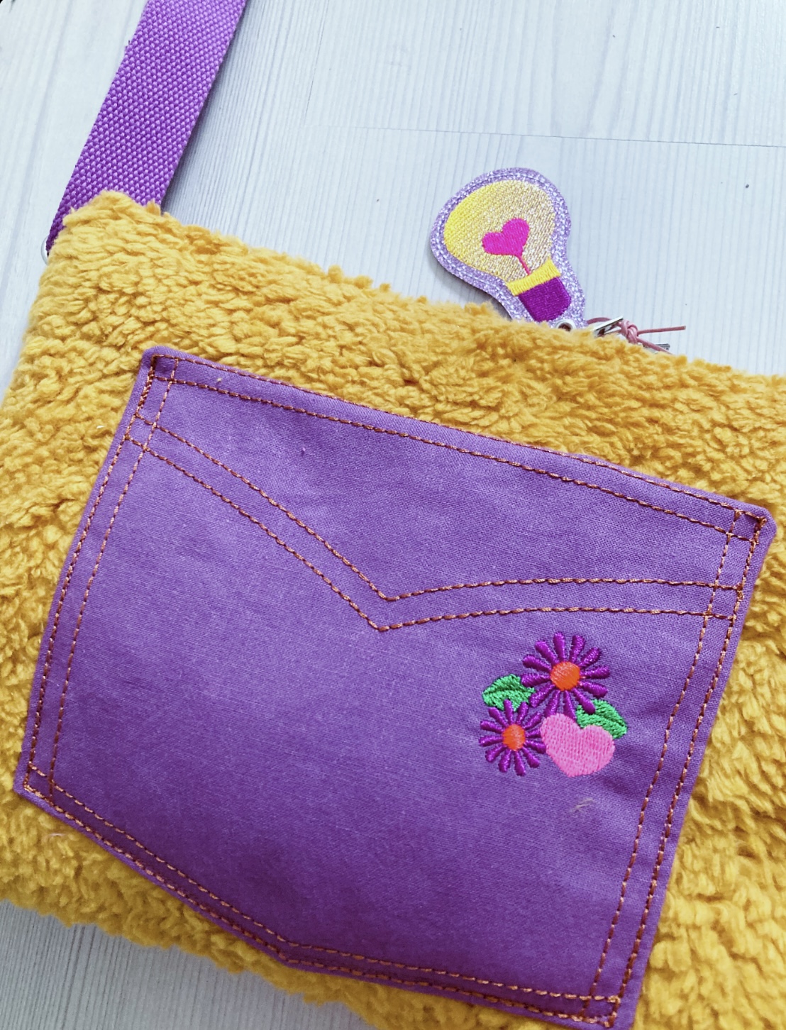 Taschenteil vorne aus Baumwollstoff, hinten aus Plüschstoff mit aufgesetzter Tasche