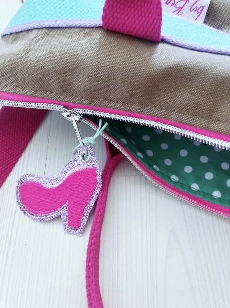 Tasche aus einen sehr festen Canvas mit Tragegriffen und zum Umhängen. Mit Bügelbildern, Anhängern, Glitzer-Applikationen und vielen Extras